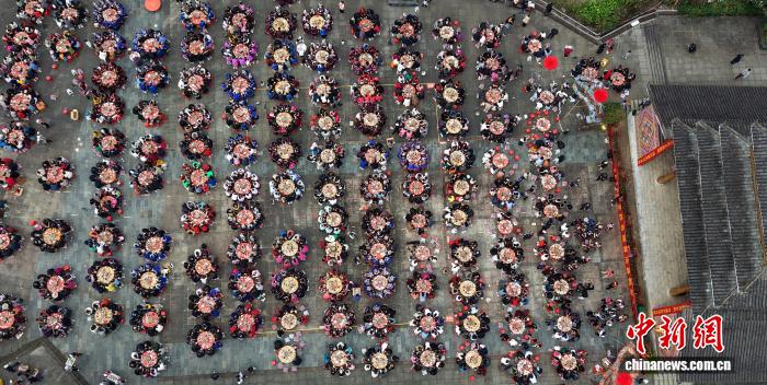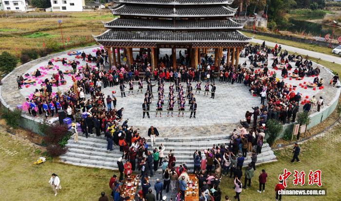 图为村平易近战乘客正在同享百家宴。(无人机像片)韦凶阳 摄