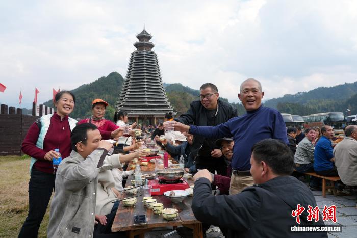图为浩繁乘客正在体会侗族百家宴。于琳钰 摄