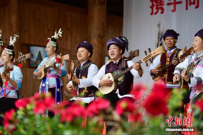 图为村平易近正在侗年庆贺举动上弹唱琵琶歌。于琳钰 摄